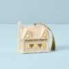 Evoking the simple beauty of a white Christmas, the Christmas Village Toy Shoppe Lighted Ornament is crafted of durable and pristine white ceramic porcelain with precious gold accents throughout. This ornament hangs from a regal gold tassel cord and includes batteries to powers its LED lights.